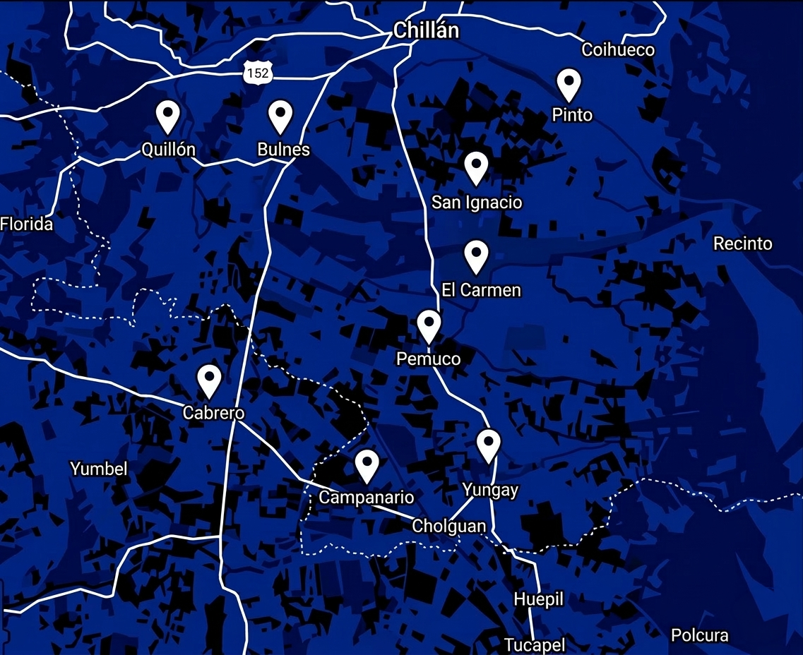 Quiriquina, Pueblo seco, San Ignacio, El carmen, Pemuco Yungay, Huepil, Trupan, Campanario, Cabrero, Bulnes, Quillón, San Carlos, Quirihue, Coelemu, Cauquenes